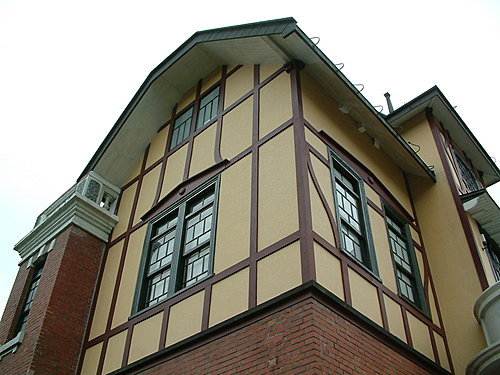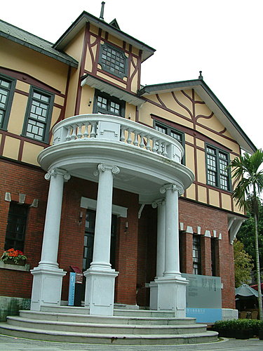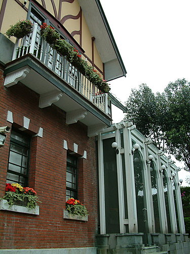 <<台北故事館簡介>>,原名為圓山別莊,建於西元一九一四年,原是大稻埕茶商陳朝駿的休閒別館,兼作招待國外貴賓訪客用途;建築風格為英國都鐸樣式建造,別具風格,曾稱為「台灣百景之最」,因為當年周圍風景如畫,商賈們只要從大稻埕碼頭乘船,沿淡水河上行到別莊登岸,沿途美景盡收眼底。一樓為紅磚結構,二樓為木結構,樑柱裸露在牆外,並刻意作成樹枝狀,此為英國所謂都鐸〈Tudor〉式常用之特色。入口設半圓形門廊,中央凸出尖塔,屋頂急斜。另外,背面的樓梯也有如一座小塔,屋頂有弧形屋簷,牆身有變體的新藝術〈Art Nouveau〉拱形窗,這些都是臺灣罕見的,彌足珍貴。(本段簡介節錄自台北市民生活網)
